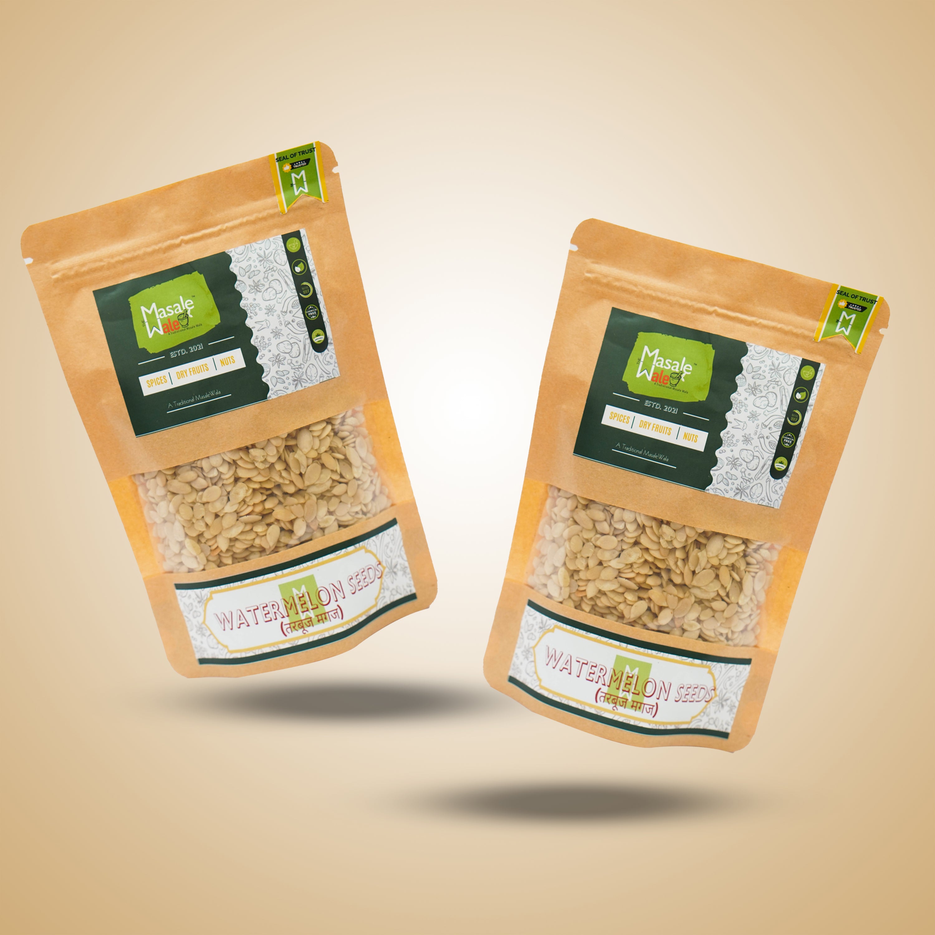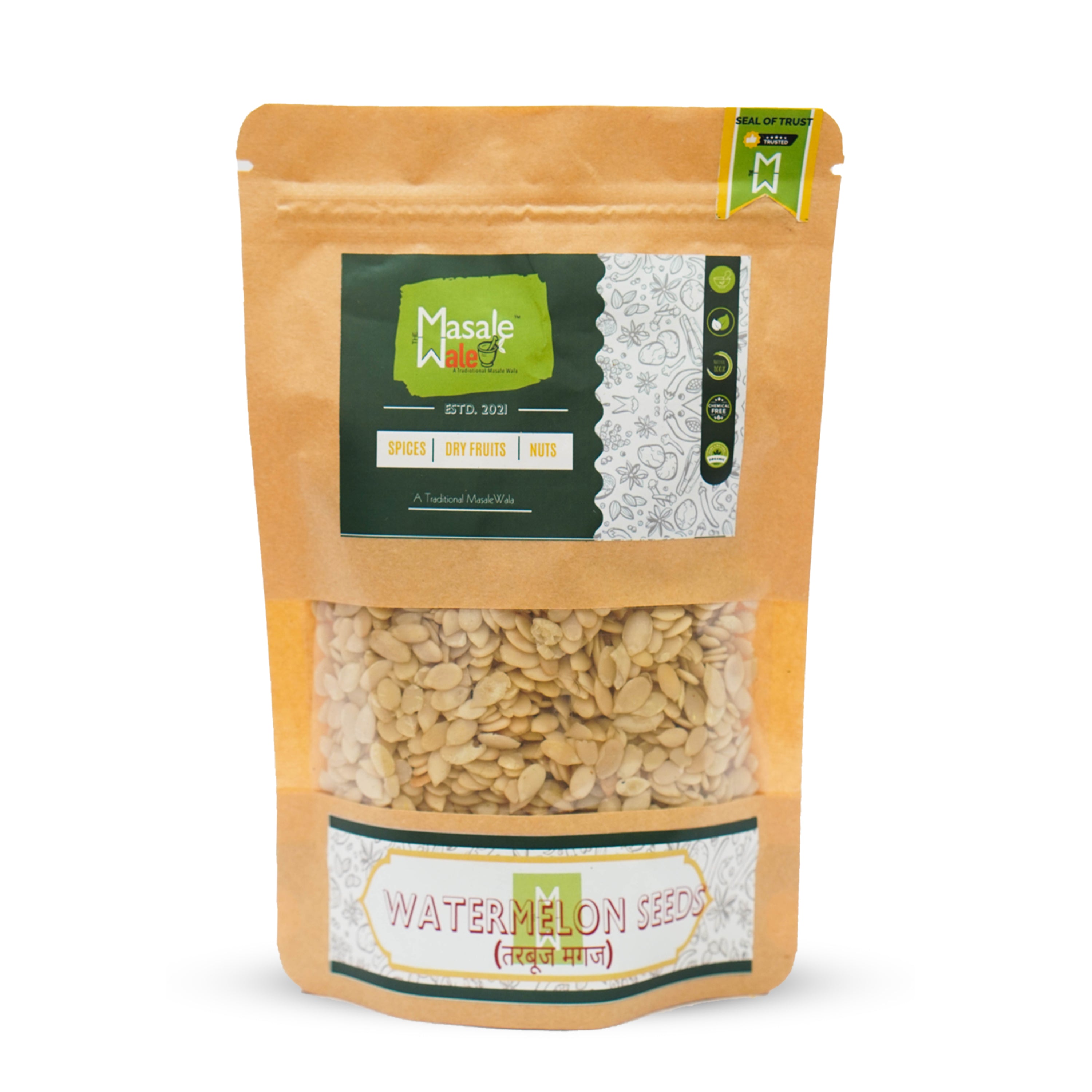 Elevate your culinary creations with the vibrant and versatile Watermelon Seeds from THE MASALEWALE. Their beautiful white shade is untouched by any artificial colouring, emphasizing their pure and adulteration-free quality. Coupled with select organic spices, these sundried watermelon seeds offer a burst of flavor to your dishes, be it salads, desserts, or snacks. We pride ourselves on using zero chemicals, maintaining the integrity and nutrition of our products. Experience a little bit of nature's goodness with every mouthful when you choose seeds from THE MASALAWALE.